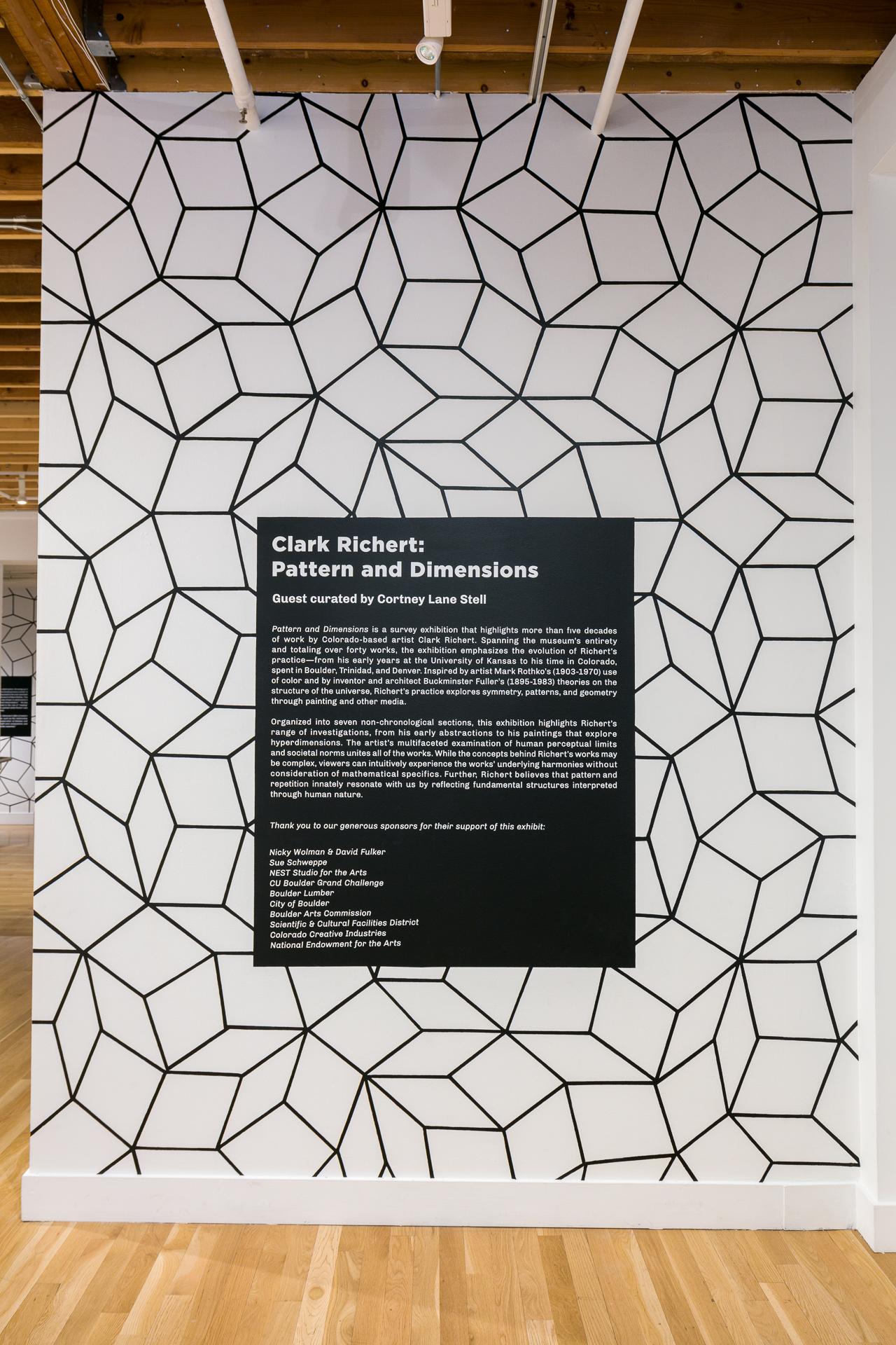 Working collaboratively with the staff at the Boulder Museum of Contemporary Art, outside of installing, uninstalling, packing and shipping art, I assisted in the creation of the visual language and overall aesthetics for the exhibition Patterns and Dimensions by Clark Richert guest curated by Cortney Stell of Black Cube Nomadic Art Museum.